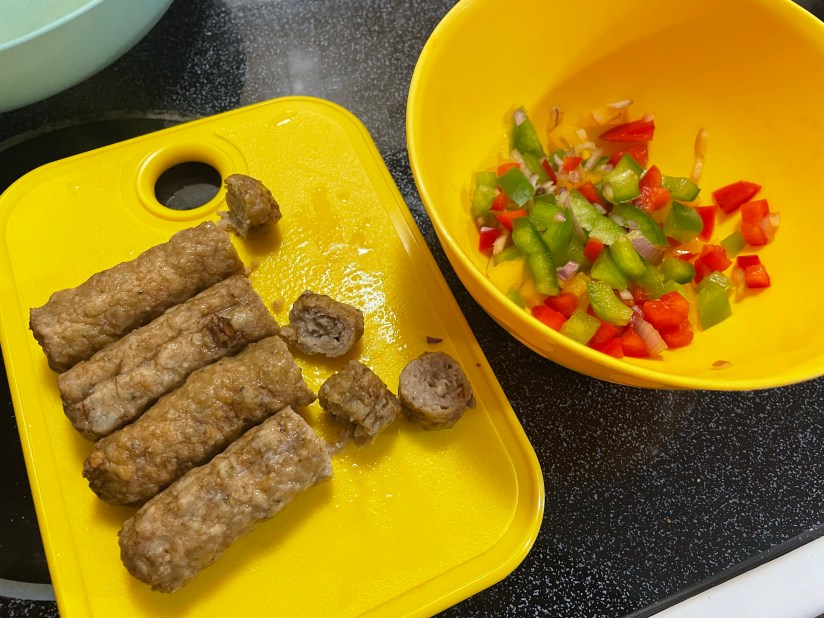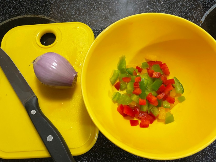 First I gathered all of my ingredients. Based on the information I received from the videos that I binged, I decided to use a shallot instead of an onion. Apparently it’s sweeter and ‘delicately’ flavored. The other ingredients used were peppers (red, green, yellow), 3 eggs (whisked), 4 pork sausages ( l will use only 2 next time), a dash of black pepper and finally cooking oil/spray. I only cut off a small piece of the shallot and peppers. Then diced them and added them together in a bowl.