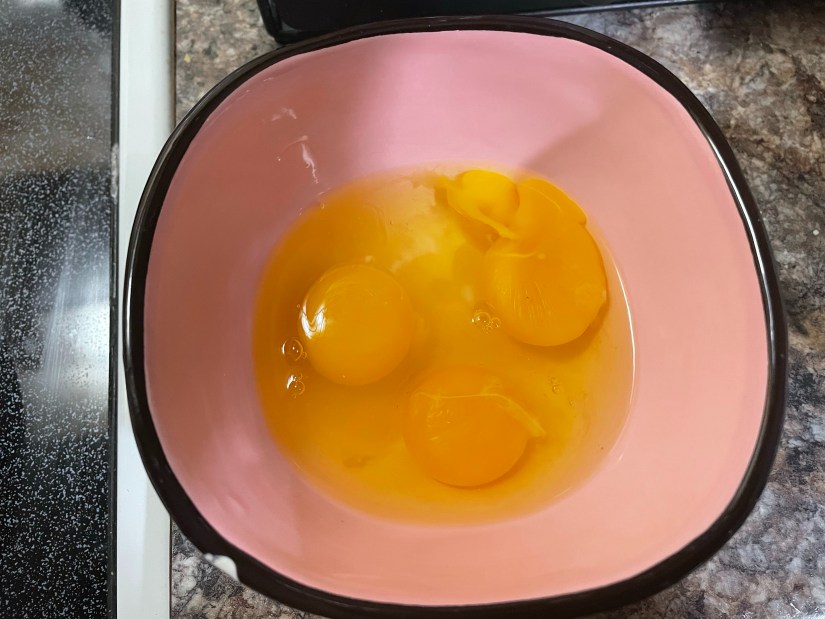 I cracked each egg separately and then added them together into a bowl. I did this to prevent ruining the other eggs in case there was a bad one. I learned to do this after a traumatizing experience I had after cracking an egg that was a little too ‘developed’.